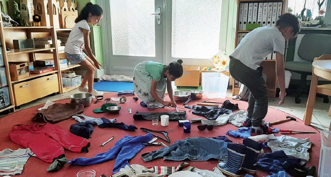 In der Kita Mathildenstraße beantworteten wir die Frage von Ibrahim und Ibtissam »Wie groß bin ich?« mit der Frage »Habt ihr Lust, Gegenstände in der Kita zu suchen, die genauso groß sind wie ihr?« Selbstverständlich hatten sie Lust! Ihr erster Gedanke war, herausfinden zu müssen, wie groß sie selbst eigentlich sind. Ibrahim schlug vor: »Jetzt musst du uns erst mal messen!« Ich fragte die Kinder, wie ich das denn machen soll. Ihr erster Vorschlag war, ein Lineal aus dem Atelier zu benutzen, und schon liefen sie los. Zurück kamen sie mit Nina im Schlepptau, die sie unterwegs getroffen hatten, und einem Lineal von 30 cm Länge. Ich scherzte: »Na, ihr seid ja winzig.« Ibrahim lachte und war der Meinung, dass ich natürlich das Lineal öfter verwenden müsse. Daraufhin ließ ich mir zeigen, wie er das meinte. Ibrahim legte das Lineal an den Füßen Ibtissams an und versuchte sich zu merken, wo er erneut ansetzen muss. Dabei stellten die Kinder fest, dass das Messen mit diesem Lineal alles andere als einfach war. Es war einfach zu kurz.