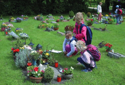 Ich war schon als Kind oft auf dem Friedhof. Einmal, um mich von dem Leichnam meines toten Opas zu verabschieden, oft, um mit meiner Oma sein Grab zu pflegen und Muster in den Weg um das Grab herum zu harken, und manchmal, um einfach mit meinem Vater spazieren zu gehen. Wir haben die leckeren Esskastanien gesammelt und geredet. Ich konnte und kann gut reden mit meinem Vater, besonders an solch einem besinnlichen Ort. Nach der Schulzeit machte ich eine Lehre als Gärtnerin auf dem Friedhof und lernte, an diesem erholsamen Ort zu allen Jahreszeiten in der Natur zu arbeiten. Friedhofsgärtner:innen sind übrigens keine traurige Truppe, sondern meist ein fröhlicher Haufen Menschen, die die Ärmel hochkrempeln, gut arbeiten und auch gut feiern können. Die Trauer der Friedhofsbesucher:innen ist Teil ihres Alltages, ihres Leben. Als ich später mit meinen eigenen sehr jungen Kindern zum ersten Mal »einfach so« auf den Friedhof ging, hatte ich Bedenken, ob das in Ordnung sei. Diese Zweifel zerstreuten sich. Wir lasen Bilderbücher und picknickten sogar dort. Meinen Kindern hat es gefallen und den Kindern, mit denen ich im Rahmen meiner Bildungsarbeit auf den Friedhof gehe, gefällt es auch.3