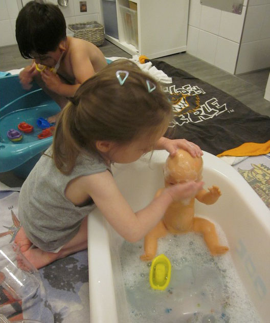 Alles fing vor vier Jahren an, als wir unsere Räume in Werkstatträume umgestalteten. Marion Tielemann, die uns auf dem Weg dahin begleitete, gab uns die Inspiration, bei all unseren Überlegungen immer darauf zu achten, was die Kinder interessiert. Wo halten sie sich auf? Was tun sie dort? Dabei stellten wir fest, dass die Kinder einen unserer Waschräume nur selten nutzten, während sich ständig Trauben von Kindern um unsere Wasserbecken bildeten, um dort mehr als nur Hände zu waschen. In einer Fortbildung über Werkstattarbeit zeigte sie uns viele anregende Fotos. Kinder in fantasievoll gestalteten Was- serwerkstätten. Kinder von Kopf bis Fuß mit Schaum bedeckt oder mit Farben bemalt. Kinder, die lustvoll mit dem Element Wasser experimentieren. Die Bilder gingen mir nicht mehr aus dem Kopf. Weil ich verstand, dass das Spiel mit dem Wasser Kinder nicht nur maßlos fasziniert, sondern ungeachtet von körperlicher Verfassung, Alter, Sprache, Geschlecht, Kultur oder besonderer Merkmale ihre Entwicklung fördert, begannen wir, eben jenen Waschraum in eine Wasserwerkstatt umzugestalten.