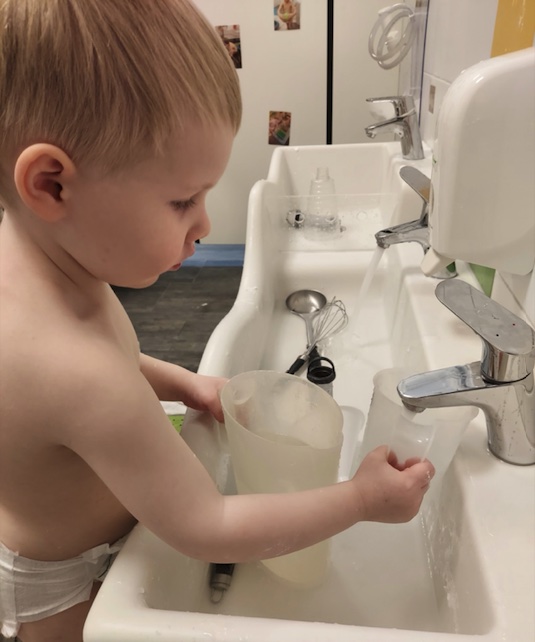 Noch während des Gestaltungsprozesses zeigte sich, dass sich eine unserer Mitarbeitenden für das Thema in besonderem Maße begeisterte. Von ihr stammen die Ideen zur liebevollen Raumgestaltung und der Materialauswahl. Wir ernannten sie zur Gastgeberin der Wasserwerkstatt. Ich staune noch heute, wie wenig es braucht, damit Kinder von einer Wasserwerkstatt wie ein Magnet angezogen werden und sie fasziniert und kreativ zugleich zu experimentieren beginnen. Genauso, wie wir es auf den Fotos gesehen hatten, die Marion Tielemann uns gezeigt hatte. Zu Beginn genügten ein Schlauch am Wasserhahn, ein paar Schüttgeräte und unsere Information, dass dieser Waschraum jetzt eine Wasserwerkstatt ist, in der sich jedes Kind, solange es möchte, aufhalten und alles ausprobieren kann, was ihm einfällt. Mit der Zeit bekamen wir ein Gespür dafür, welche Materialien Kinder besonders inspirieren, ihr Tun und ihr Lernen im eigenen Tempo selbst in die Hand zu nehmen. Es sind vor allem die unterschiedlichen Formen und Größen der Becher und Eimer zum Hin- und Herschütten, auch Spritzen und Sprühflaschen, Schwämme und Tücher, Rasierschaum, Seifen, Farben und Seifenblasen haben sich gut bewährt. Wie in jeder anderen Werkstatt achten wir darauf, dass die Materialien visuell ansprechen, aber gleichzeitig für das Auge »ruhige« Materialien sind. Transparente Becher, Eimer, Flaschen und Gefäße zum Durchschauen eignen sich besonders, denn sie ermöglichen es den Kindern nachzuvollziehen, wie und wohin das Wasser fließt. Dadurch können sie schneller Rückschlüsse auf ihr eigenes Handeln entwickeln und sich eigenständig reflektieren und weiterentwickeln. Damit sich die Kinder gut orientieren und die Materialien auch selbständig wieder an ihren Ort zurückbringen können, kennzeichnen wir deren Platz mit Fotos.