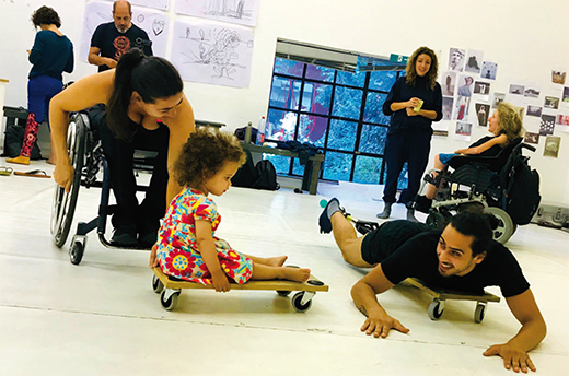 Aurora lernt gemeinsam mit mir in der bewegungsreichen Atmosphäre mit unterschiedlichen Tänzer:innen die Diversität der Bewegungen kennen. Die Tänzer:innen nahmen sie bereits als Baby auf die Arme und tanzten zusammen mit ihr durch das Studio. Dabei waren die Möglichkeiten, wie sie Aurora durch das Tanzstudio bewegten, sehr individuell: Sie setzten sie zu sich auf den Rollstuhl, hielten ihre Hand im Tanz mit der Handprothese fest oder rollten mit ihr auf Rollbrettern durch den Raum. So erhielt Auroras Körper vielfältige Information über die Organisationen diverser Körpersysteme. In der Bewegung sind alle unsere Sinne – Sehen, Hören, Riechen, Schmecken, Fühlen – Teil dieser Wahrnehmung, und das Erfahrene auf allen Ebenen kann in den Körper integriert werden.