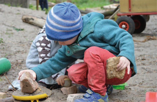 Ein Team mit unterschiedlichen Meinungen zur Risikoeinschätzung sei gut und richtig, erfahre ich von Kitaleitung Eva Messlin. Ich treffe sie in ihrem Büro, bevor ich mich selbst auf den Weg durch die Einrichtung, auf der Suche nach risikohaften Erfahrungen, begebe. Wichtig sei jedoch, dass alle von ihr als Dienstanweisungen formulierten No-Gos, wie z.B. »der Fallschutz muss gewährleistet«, eingehalten werden. »Im Garten haben wir nicht nur Schaukeln, mit denen sich richtig hoch schaukeln lässt, sondern auch hohe Klettergerüste, eine Slackline, Hängematten und vieles mehr, von dem Kinder herunterfallen können.« Fallschutz bedeute also nicht, dass ein Kind nicht herunterfallen darf, sondern dass ein Untergrund gewährleistet sein muss, auf dem ein Sturz glimpflich ausgeht. Deshalb sei eins der No-Gos, dass dort harte Gegenstände liegen: »Runterfallen ist in Ordnung, aber nicht auf einen Stein oder einen Metallgegenstand.« Dies würde auch den Kindern, selbstverständlich kindgerecht, vermittelt: »Wenn wir Kinder dazu anhalten, Steine an die erlaubten Orte zurückzubringen, sagen wir: Guck mal, wenn du von oben auf die Hackschnitzel fällst, passiert vielleicht was, aber das wird nicht so schlimm sein. Wenn du aber auf den Stein fällst, vielleicht sogar mit dem Kopf drauf landest, dann ist es nicht gut. Also schlepp den Stein bitte wieder von hier weg.« Die Steine abzuschaffen, ist für sie keine Alternative: »Wir wollen, dass die Kinder sie umherschleppen und damit bauen können. Aber eben nicht an allen Orten.