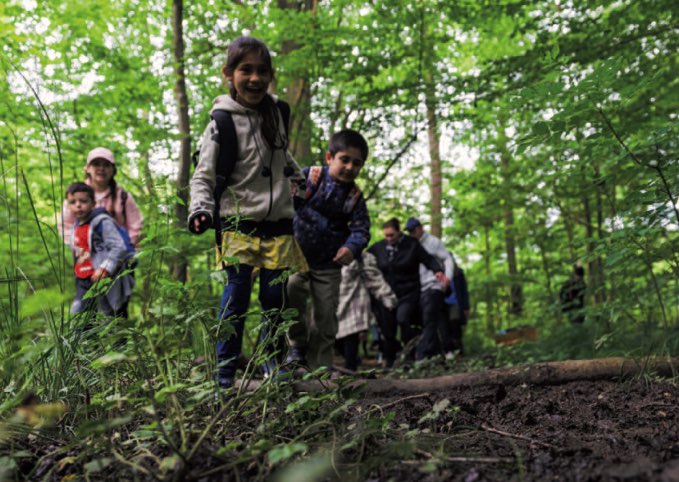 Das Mädchen hat lange schwarze Haare und eine zarte Figur. Mit ihrem weißen Spitzenkleid würde sie eher auf eine Familienfeier passen als in den Wald. Von ihrer Klassenlehrerin Hanna Rehbehn erfahre ich, dass sie aus Afghanistan stammt und wie die meisten ihrer Klasse einen Namen trägt, den ich noch nie gehört habe. Dreiviertel der Kinder oder ihrer Familien stammen nicht aus Deutschland. Fünf Kinder haben sonderpädagogischen Förderbedarf. Das Mädchen im weißen Kleid ist nicht die Einzige, die für den kühlen Wald, wo uns Mutter Erde in Gestalt von morschem Holz, schleimigen Nacktschnecken und stechenden Mücken begegnet, wenig angemessen gekleidet ist. Wir lassen den Kindern die Zeit, sich in ihrem Tempo mit dem Wald und all dem, was sich hier entdecken lässt – Regenwürmer, Eierschalen, Federn, Pilze, Erdkröten, Mücken oder Tausendfüßler –, vertraut zu machen. Am Ende des ersten Tages resümieren wir Begleiter:innen, dass wir kleine Schritte gehen und wertschätzen wollen.