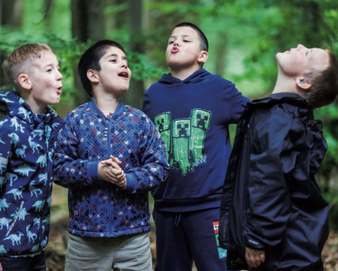Die Möglichkeit, sich frei im Wald zu bewegen, statt am immer selben Platz in der Schule zu sitzen, sollte den Bezug der Kinder zur realen Welt, ihre Lust am Sprechen, Lesen, Erinnern und Spielen stärken. Das Spiel verstehen wir dabei nicht als Belohnung oder Zugabe, sondern als wichtige Grundlage zur Stärkung von Basiskompetenzen wie Lesen, Schreiben und Rechnen sowie der »Vier K«s des Lernens: Kommunikation, Kooperation, Kritisches Denken und Kreativität. Sieben Tage in sieben Wochen war der zeitliche Rahmen unseres Leseprojekts mit dem Titel »Wer ist die Stärkste im ganzen Land? Draußen – Aktiv – Lesen«, mit dem Ziel, Themen aus dem Buch »Der Stärkste im ganzen Land« aufzugreifen, zu erleben und als Aufführung anlässlich des zu Projektende geplanten Schulfestes aufzuführen. Die Geschichte von einem Wolf, der sich solange angeberisch als Stärkster im ganzen Land aufführt, bis der kleine Quabbelwabbel ihn infrage stellt, weil er findet, dass seine Mutter die Stärkste ist, hatten wir gezielt ausgewählt. Mit ihr wollten wir den Kindern, von denen viele schwierige Lebenssituationen mitbrachten und mit geistigen, sozialen oder starken seelischen Einschränkungen lebten, die Erfahrung ermöglichen, dass es mehr Formen der Stärke gibt als dicke Muskeln, eine laute Stimme oder vermeintlich starkes, im Grunde aber unkontrolliertes Verhalten. Bereits am ersten Tag fanden wir mit unserem »Blick-Battle« heraus, dass es eine Stärke ist, einem Gegenüber in die Augen zu schauen, dem Blick nicht auszuweichen und dabei nicht zu zwinkern oder zu lachen. Tatsächlich waren die Kinder nicht nur sehr gut im »Nicht-Zwinkern«, sondern hatten auch Freude an dieser besonderen Art der Augenblicke und daran, diese in der Abschlussrunde mit allen teilen.