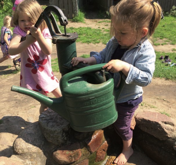 Das wäre zu einfach, zu teuer und zu wenig nachhaltig. Der Klimawandel macht auch in Deutschland das Trinkwasser zu einer knappen Ressource – abgesehen von den Kosten, die es verursacht, wenn man größere Mengen von kostbarem Trinkwasser zum Spielen verwenden würden. Es gibt andere Möglichkeiten: Zum einen kann man mit einer Handpumpe das Grundwasser anzapfen. Ob Grundwasser geeignet ist, hängt von den örtlichen Gegebenheiten ab. Eine andere Möglichkeit ist, Regenwasser von Dachflächen in einer unterirdischen Zisterne zu sammeln und es daraus ebenfalls per Hand herauszupumpen. Mit beiden Varianten haben wir seit mehr als drei Jahrzehnten gute Erfahrungen gemacht. Es gibt inzwischen unterschiedliche Modelle von Pumpen, die auch von Kindern gut zu bedienen sind. Die meisten Kinder sind fasziniert davon, Wasser zu pumpen. Sie erleben Selbstwirksamkeit und erfahren, wie sie sich mit eigener Anstrengung Wasser für ihr Spiel holen können. Außerdem ist eine Wasserpumpe im Spielbereich immer auch eine Einladung zur Kooperation: Ein Kind kann nicht gleichzeitig das Wasser fließen lassen und damit spielen. Die Kinder müssen sich also abstimmen, wenn sie mit Wasser spielen wollen. Und das tun sie ganz intuitiv. Soziales Lernen ist ein »Beifang« des Spiels mit Wasser.